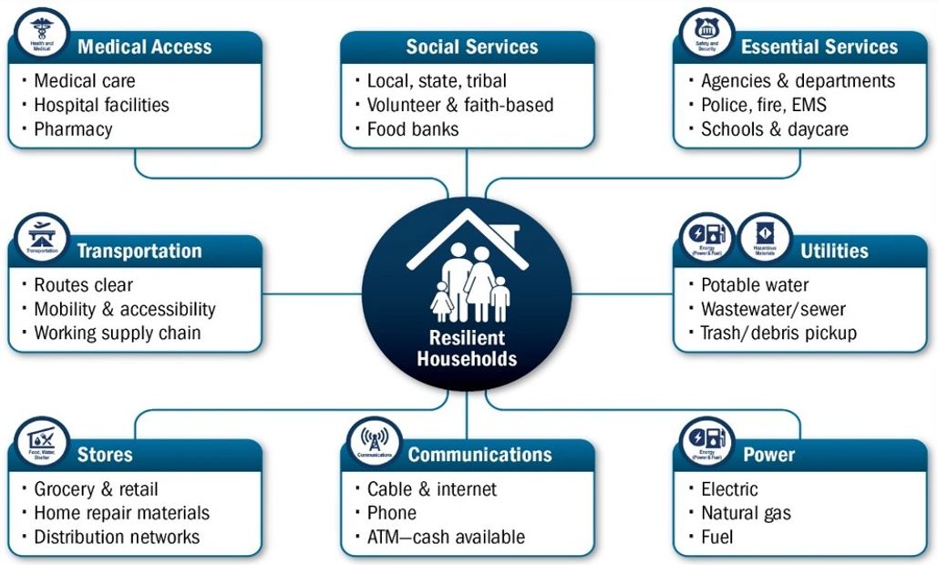 Individual households are the building blocks of the complex network that makes up a community. The resilience of households directly impacts the resilience of a community. Resilient households depend on food, water, shelter, and access to money.